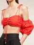 • scollatura off-shoulders con maniche a palloncino e motivo di lacci ad incrocio frontale